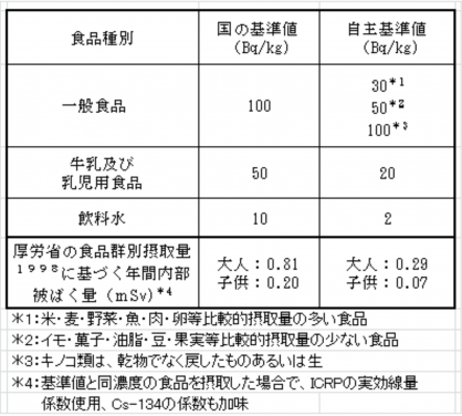 しかしながら、市民としては、選択できるならば出来る限り放射能フリーの食品を求めたいと思い、また止む無く原発事故の影響を受けた食品を取る場合には、どれほどの内部被ばく線量であるのかを確認することは、この長い放射能汚染時代を生き抜くためには、必要である。自主基準値については、限りなく0 Bq/kgを目指すべきとの考え方もあるが、測定装置の性能に限界もあり、食品別の摂取量も考慮し、食品中に含まれる天然の放射性物質からの被ばく量のおおよそ2倍程度までを許容するという提案とした(表1)。