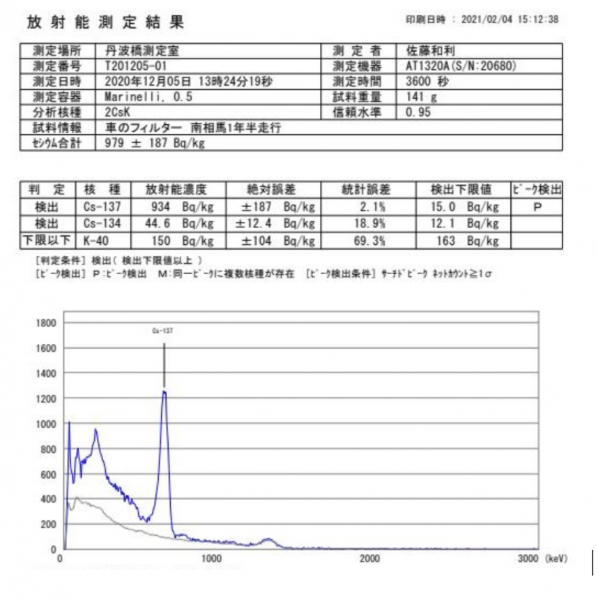 これは福島県南相馬市で1年半走行していた車から外したエアコンフィルターですが、土壌から舞い上がった放射性セシウムを吸着したものではないかと考えます。測定開始とともに、パソコン画面の放射性セシウムを示すスペクトルがグングン立ち上がっていきました。最終的に放射性セシウム137の濃度が934ベクレル/kg、セシウム134の濃度が44.6ベクレル/kgという値が出ました。