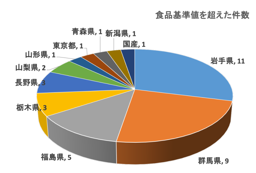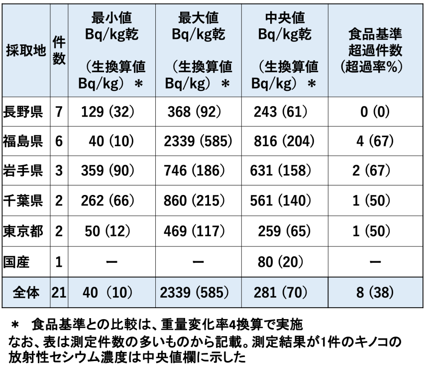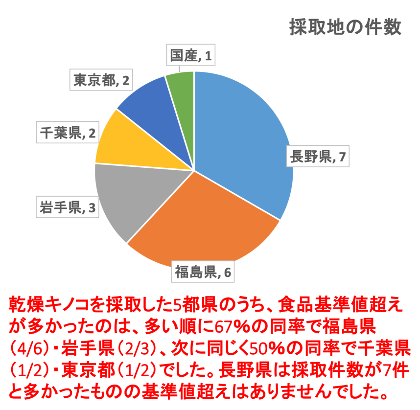 長野県は採取件数が7件と多かったものの基準値超えはありませんでした。したがって、長野県産は生キノコでは食品基準値超えがありましたが、乾燥キノコでの基準値超えはありませんでした。