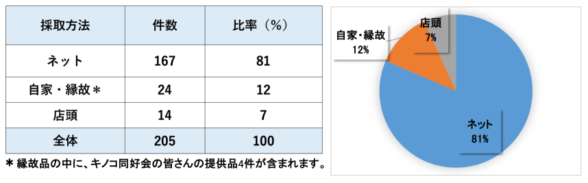 採取したキノコは全て山野に生育する野生キノコ205件で、ネット購入品が81%(167/205件)を占め、次に自家採取・縁故品が12%(24/205件)、道の駅・スーパー等の店頭購入品が7%(14/205件)でした。