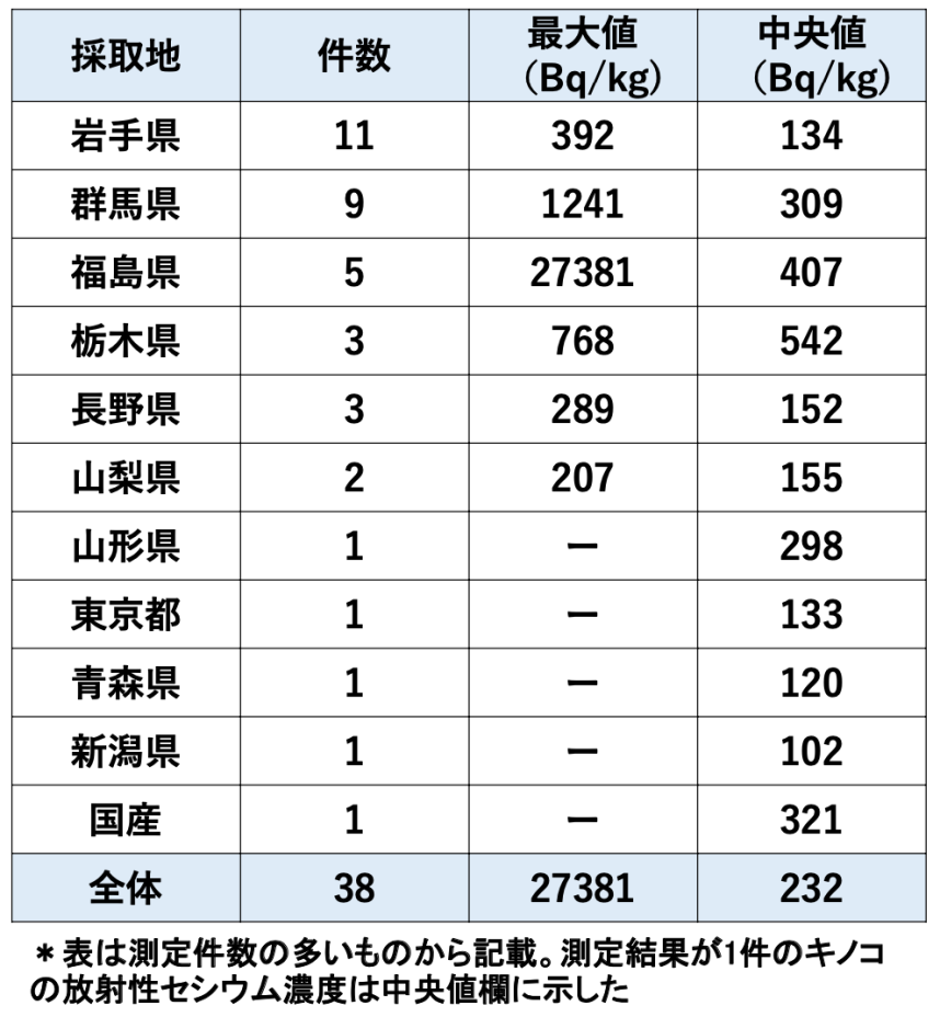 なお、表は測定件数の多いものから記載。測定結果が1件のキノコの放射性セシウム濃度は中央値欄に示した。