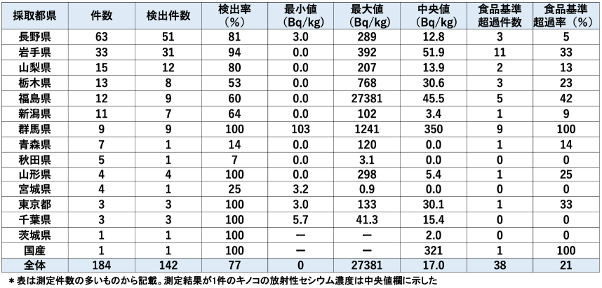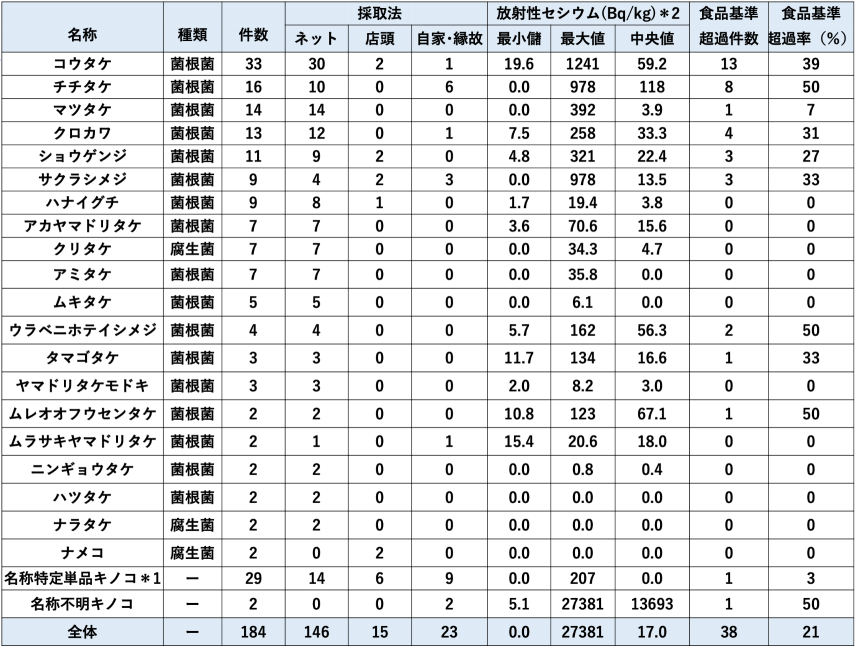 生キノコは184件が測定され、放射性セシウムが検出(最小値は0.8 Bq/kg)されたのは77%(142/184件)、最大値は27,381 Bq/kg、中央値は17.0 Bq/kgで、食品基準値100 Bq/kgを超えたものは21%(38/184件)でした。