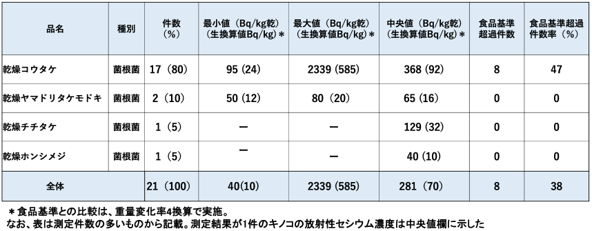 乾燥キノコは21件が測定され、放射性セシウムは全ての乾燥キノコで検出されました。最大値は2,339 Bq/kg乾(厚生労働省の示す「その他のキノコの乾燥による重量変化率4.0」を基にした生換算値 585 Bq/kg)、中央値は520 Bq/kg乾(同130 Bq/kg)で、食品基準値を超えたものは38%(8/21件)でした。