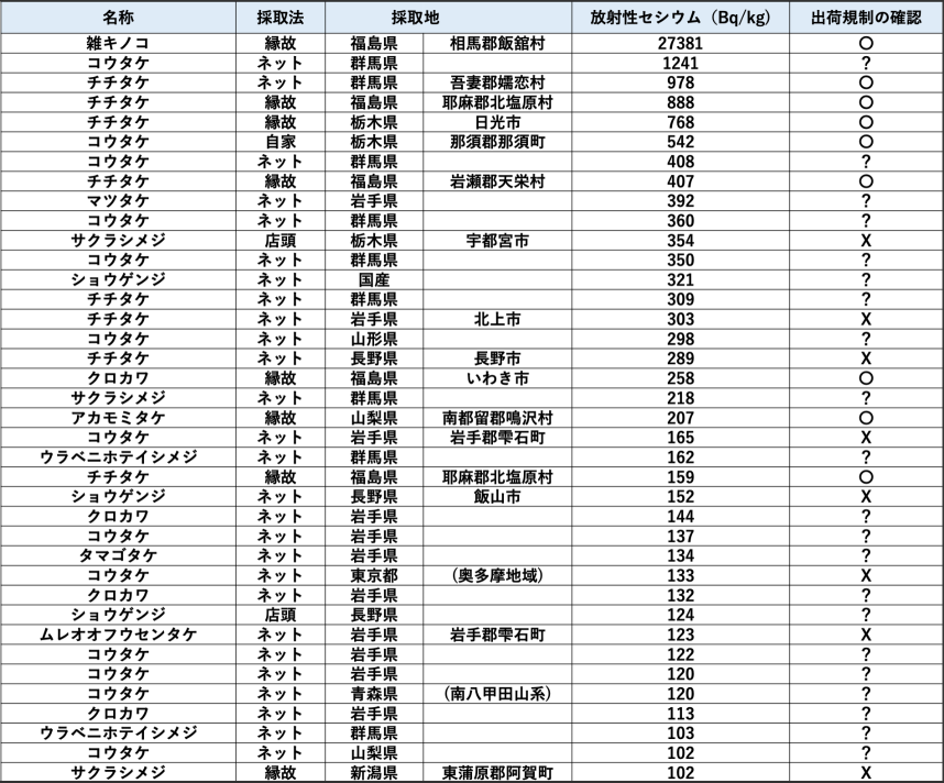 食品基準値を超えたキノコの採取地について、出荷制限の有無を確認しました(〇:出荷規制有り、 X:出荷規制無し、?:採取地が県名までで市町村名が不明のため出荷規制の確認が出来ない)。