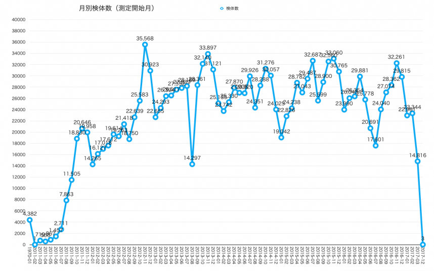 追記:これ以降のデータは解析に含まれていませんが、2018年以降、厚労省からの発表が月1回となり、徐々に各自治体での測定件数も減少しているという現状があります。
