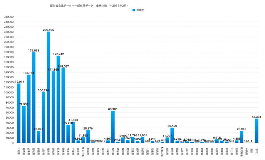 2017年3月末までに公開されているデータに、一部東京電力が測定し発表している福島県などの食品のデータをあわせたものを今回入手し、統計に着手しました。1,703,468件。(2011年3月〜2017年3月まで)