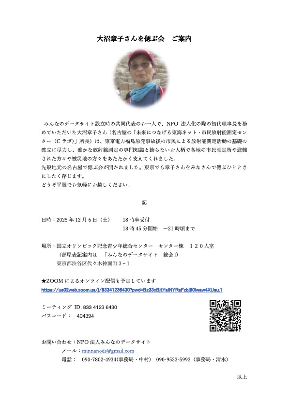 【東京】12月6日(土)18時半から大沼章子さんを偲ぶ会のご案内