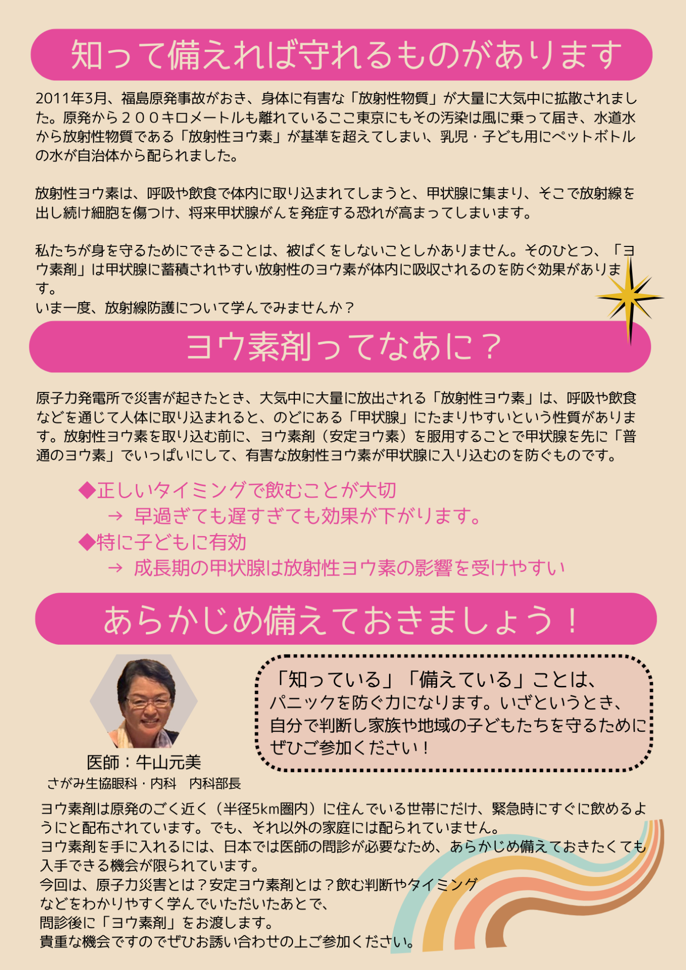 当日は、牛山先生による説明の後、希望の方に問診後、安定ヨウ素剤をお渡しします!
