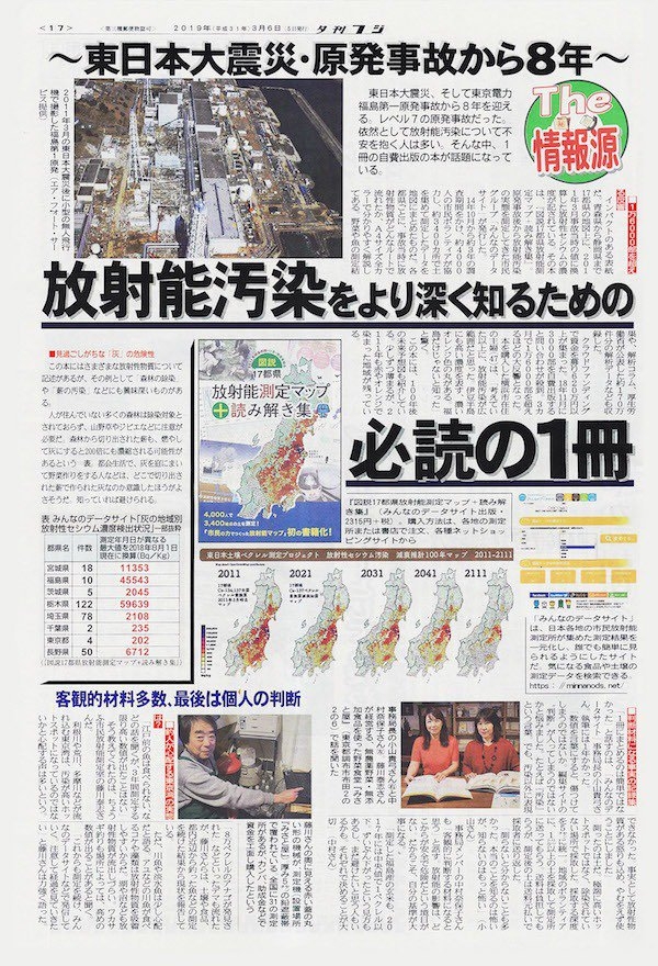 2019年03月11日 【メディア掲載】夕刊フジ(3月6日号)the情報源に掲載されました 夕刊フジ「The情報源」に『放射能汚染をより深く知るための必読の一冊』としてカラーページで大きくマップ集を取り上げていただきました! 男性読者が多いので、アウトドアを意識して灰のことなども取り上げていただきました。 夕刊ということで、売っている時間が短かく、すぐに売り切れてしまったという声も聞いています。 バックナンバーを発見しましたらぜひご覧くださいませ。