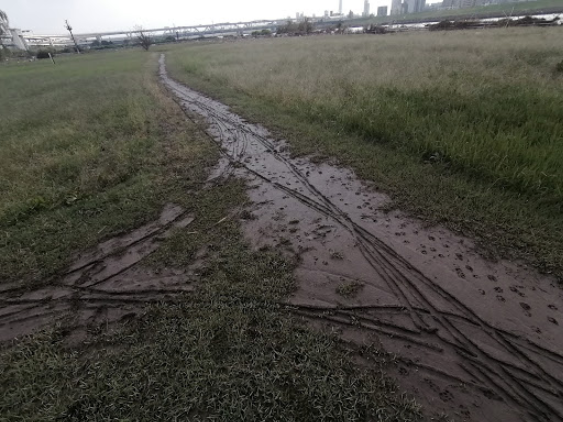 多摩川河川敷一帯の様子をうかがったところ、河川敷一帯も氾濫した様子があり、辺りに泥土の堆積が観られた。