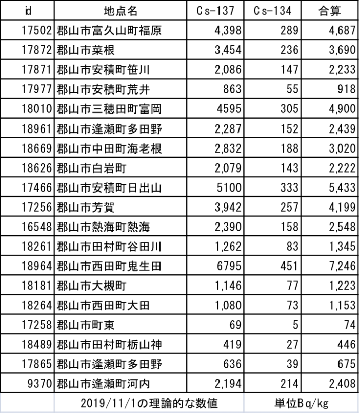 参考までに、みんなのデータサイトによる東日本土壌ベクレル測定プロジェクトで測定した、郡山市の土壌数値を2019年11月1日時点に補正した数値を出してみました。