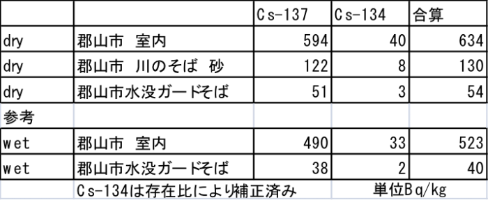 注釈:今回測定された数値は、「東日本土壌ベクレル測定プロジェクト」で測定した周辺地域の数字と比較すると、特段に高い数値ではありませんでした。しかし、他の県と比べると高い数値ではありますし、事故前との比較(例:2010年福島市、Cs-137: 23 Bq/kg)では明らかに高汚染ですので、泥かきの際にはマスク等で吸い込まないようにするなど十分ご注意頂けたらと思います。(みんなのデータサイト事務局)