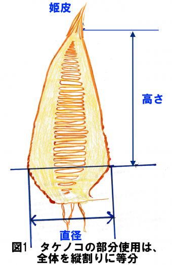 タケノコは先端部分に放射性セシウムが集まりやすいことが、明らかになっています。そこで、測定容器に詰めるための前処理では、洗浄して水分を除去した後、外皮をむき、姫皮部分も含めた可食部を、図1のように縦割りにして使用しました。