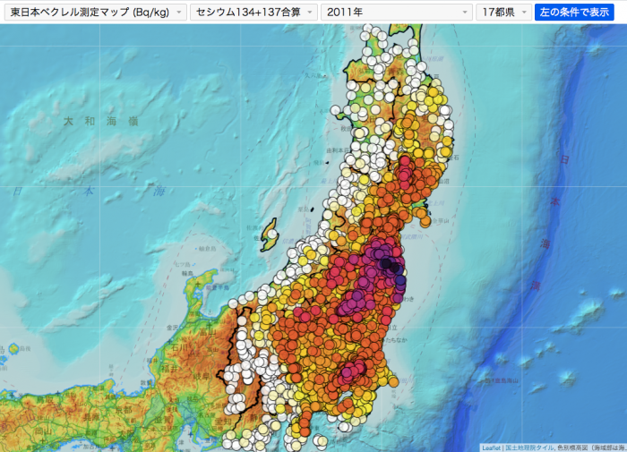 以下のみんなのデータサイトの「東日本土壌ベクレル測定プロジェクト」による土壌放射能測定マップと見比べてください。