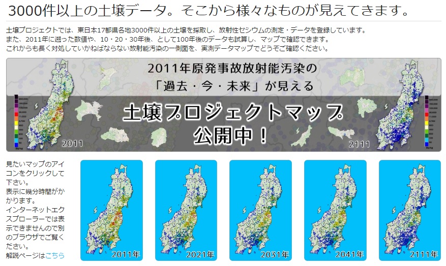 ●ウェブサイト改変により、わかりやすいサイト・役立つサイトを目指しますこの土壌プロジェクトの結果をより見やすく、また今回ご覧いただいた、現在・過去・未来の汚染状況を閲覧できる機能をより充実させていく予定です。