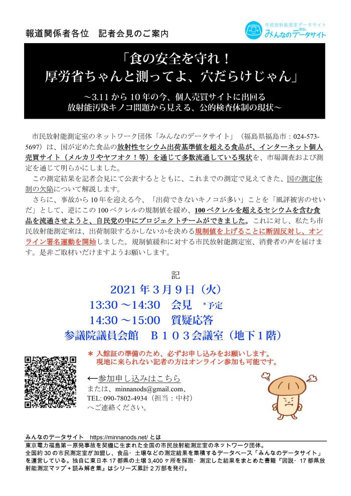 プレスリリース:「食の安全を守れ! 厚労省ちゃんと測ってよ、穴だらけじゃん」 〜3.11から10年の今、個人売買サイトに出回る 放射能汚染キノコ問題から見える、公的検査体制の現状〜 記者会見のご案内