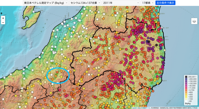 米どころである新潟県南魚沼市は、福島県や群馬県境と接する地域。2011年の事故当時、越後山脈を超えて一部のプルーム(放射能雲)が到達しており、これまでも山菜のコシアブラが200 ベクレル/kgを超えたケースが続出した地域(下図マップの概ね水色で囲んだあたり)です。