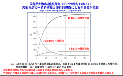 ICRPの資料によると、成人のケースで1日10ベクレルずつ摂取を続けると、800日後に摂取と排出がほぼ平衡に達して、体内放射能量は1500ベクレルに達します。一方、1000ベクレルの食品を1回だけ摂取した場合は、100日後には毎日10ベクレル摂取の曲線を下回り、800日後にはほぼゼロベクレルになっています。