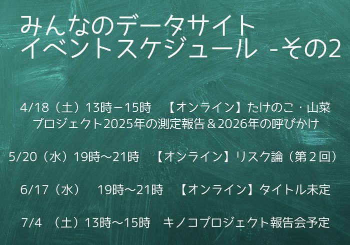2026年01月07日 2026年上半期 学習会・イベントスケジュールのお知らせ みんなのデータサイトの2026年は、みなさまと共に学ぶ学習会・講演会等の機会をなるべくたくさん作っていくことになりました! 定期的な学習会として、毎月第3水曜日の19時から開催します! その他、リアルイベントや他団体とのコラボレーションイベント等、決定次第、随時お知らせしていきます。 詳細は、このブログにそれぞれのトピックをアップしていきます。 またみんなのデータサイトFacebookページでも同様にお知らせしていきます。 本年もみんなのデータサイトをどうぞよろしくお願いします!