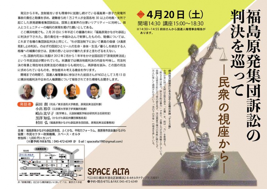 | 主催・連絡先 | 主催:福島原発かながわ訴訟原告団、福島原発かながわ訴訟を支援する会、 平和力フォーラム、脱原発市民会議かながわ 協賛:市民セクター政策機構 、スペース・オルタ 問合せ:スペース・オルタ(130席、※要予約TEL&FAX:045-472-6349まで) E-mail:spacealta1985★gmail.com(★を@に変えてください) |