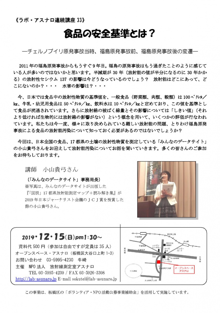 | 内容 | 《ラボ・アスナロ連続講座33》 食品の安全基準とは? ―チェルノブイリ原発事故当時、福島原発事故前、福島原発事故後の変遷― 2011年の福島原発事故からもうすぐ9年目。福島の原発事故はもう過ぎたことのように感じている人が多いのではないかと思います。半減期が30年(放射能の値が半分になるのに30年かかる)の放射性セシウム137の影響は今どうなっているのでしょう? 放射能はどこにあって、どこにないのか?・・・ 水害の影響は?・・・ 今、日本では食品中の放射性物質の基準値を、一般食品(野菜類、肉類、穀類)は100ベクレル/㎏、牛乳・幼児用食品は50ベクレル/㎏、飲料水は10ベクレル/㎏と定めており、この値を基準として食品が流通されています。さらに放射線の被ばく線量とその影響については「しきい値」(それより低ければ生物的には放射線の影響がない)という概念を用いて、いくつかの評価が行なわれています。私たちは今一度、様々に取り決められている難しい放射能の問題、とりわけ福島原発事故による食品の放射能汚染について知っておく必要があるのではないでしょうか? 今回は、日本全国の食品、17都県の土壌の放射性物質を測定している「みんなのデータサイト」の小山貴弓さんをお迎えして放射能汚染についてお話を聞いていきます。多くの皆さんのご参加をお待ちしております。 講師 小山貴弓 (「みんなのデータサイト」事務局長) |