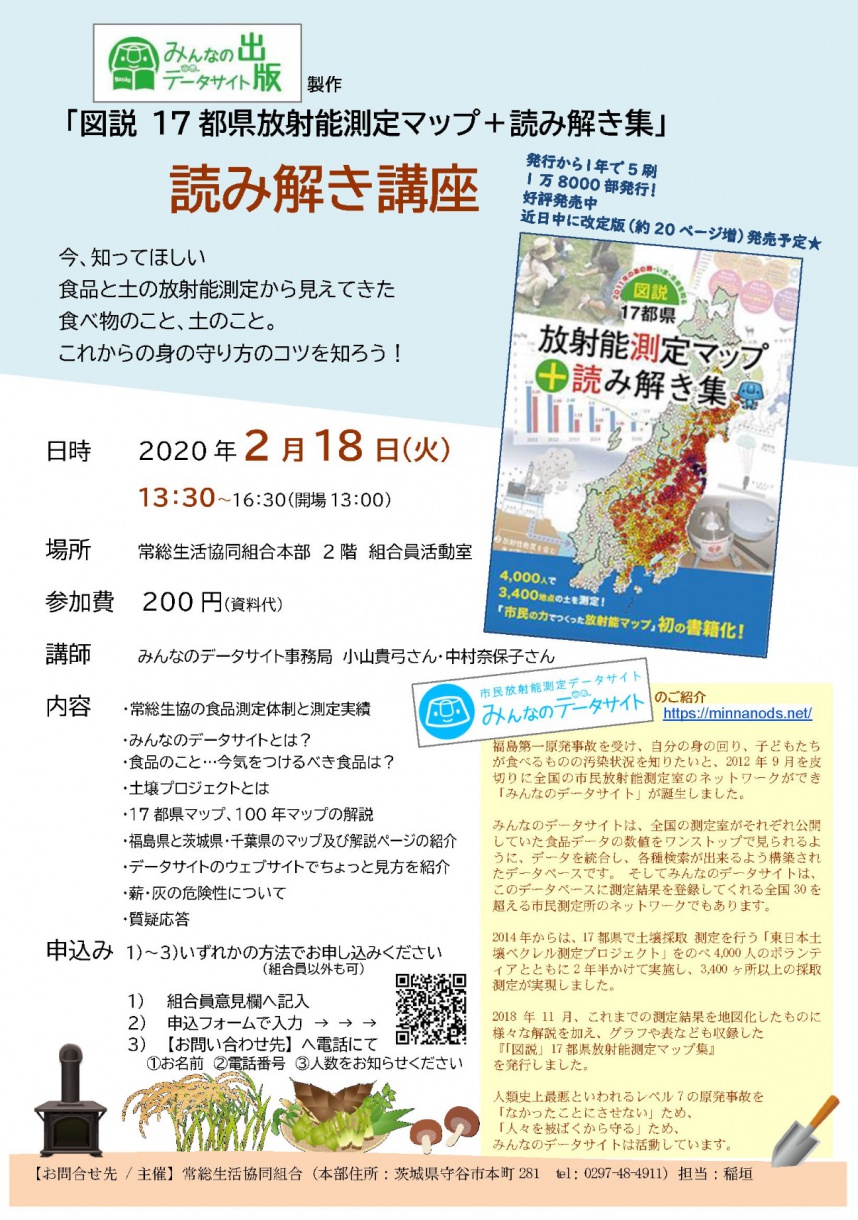 | 内容 | 市民が作った放射能測定マップを執筆・編集した、 みんなのデータサイト 事務局長小山、事務局中村がお話しします。 常総生協の測定の取り組みについても、常総生協の方に紹介していただきます。 組合員でなくても参加できます。 お申し込みはこちら <内容> ・常総生協の食品測定体制と測定実績 ・みんなのデータサイトとは? ・食品のこと・・・今気をつけるべき食品 ・土壌プロジェクトとは? ・17都県マップ、100年マップの解説 ・福島県と茨城県、千葉県のマップおよび解説ページの紹介 ・データサイトのウェブサイトでちょっと見方を紹介 ・薪・灰の危険性について ・質疑応答 |