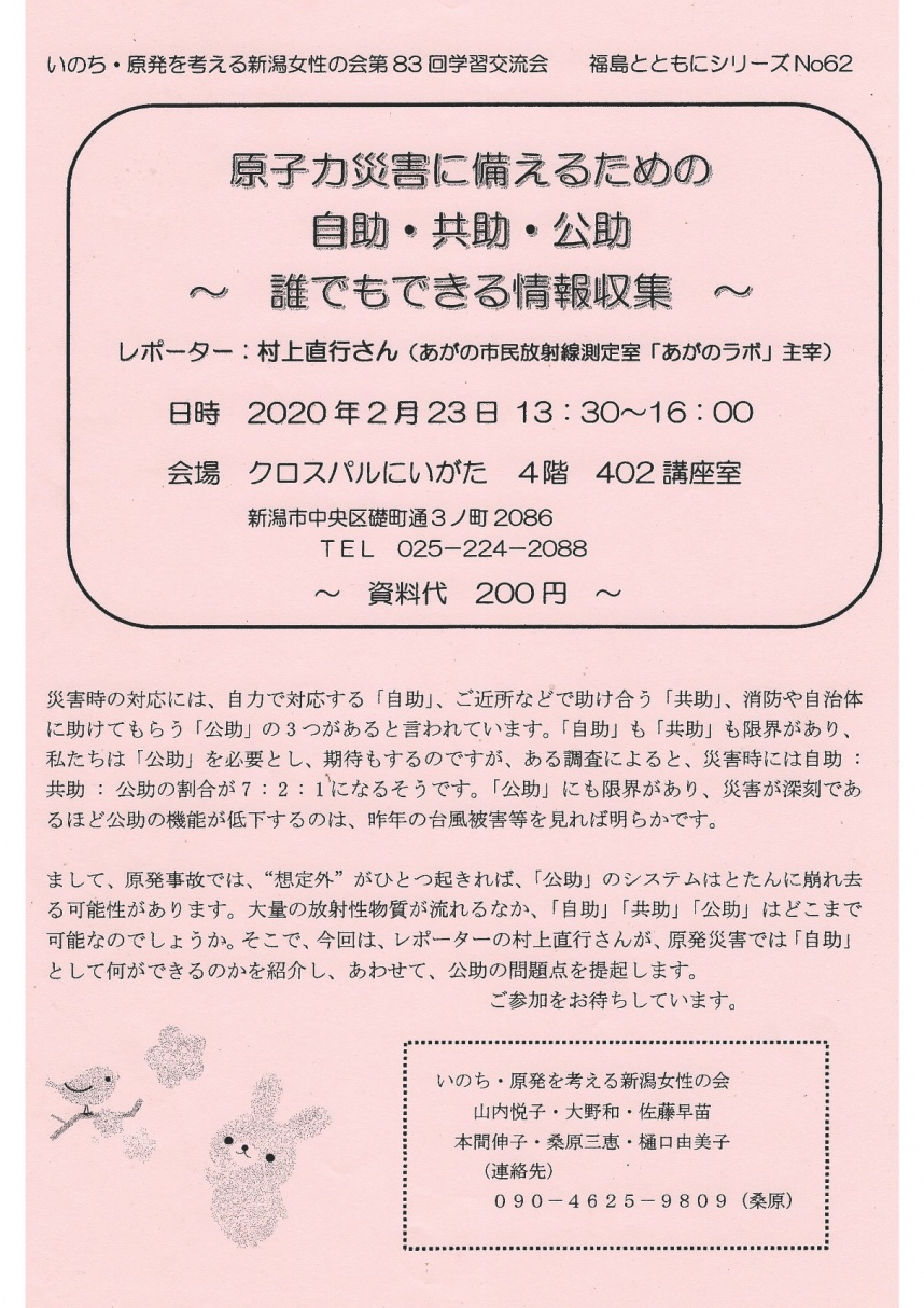 | 主催・連絡先 | いのち・原発を考える新潟女性の会 山内・大野・佐藤・本間・桑原・樋口 090-4625-9809(桑原) |