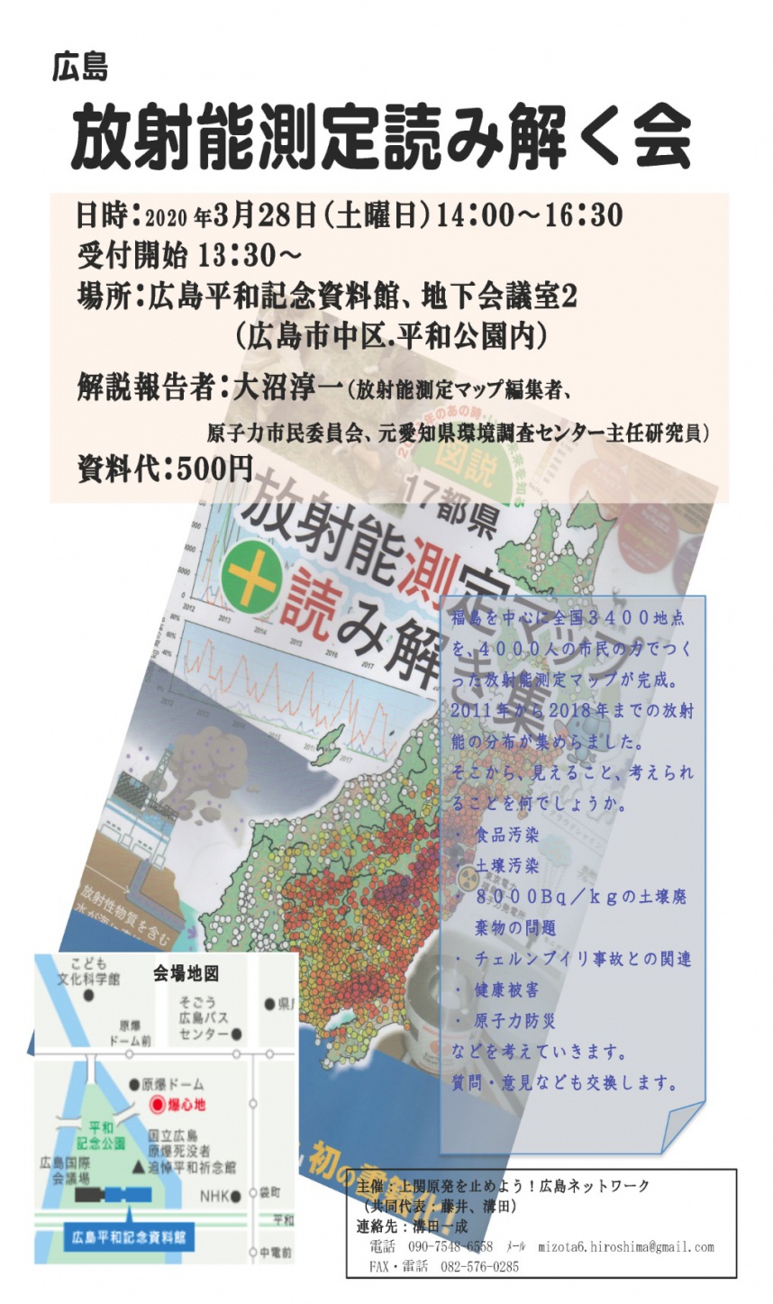 | 内容 | 広島 放射能測定読み解く階 受付:13時30分〜 講座:14時〜16時30分 解説報告者:大沼淳一(放射能測定マップ編集者、原子力市民委員会、元愛知県環境調査センター主任調査員) 資料代:500円 |