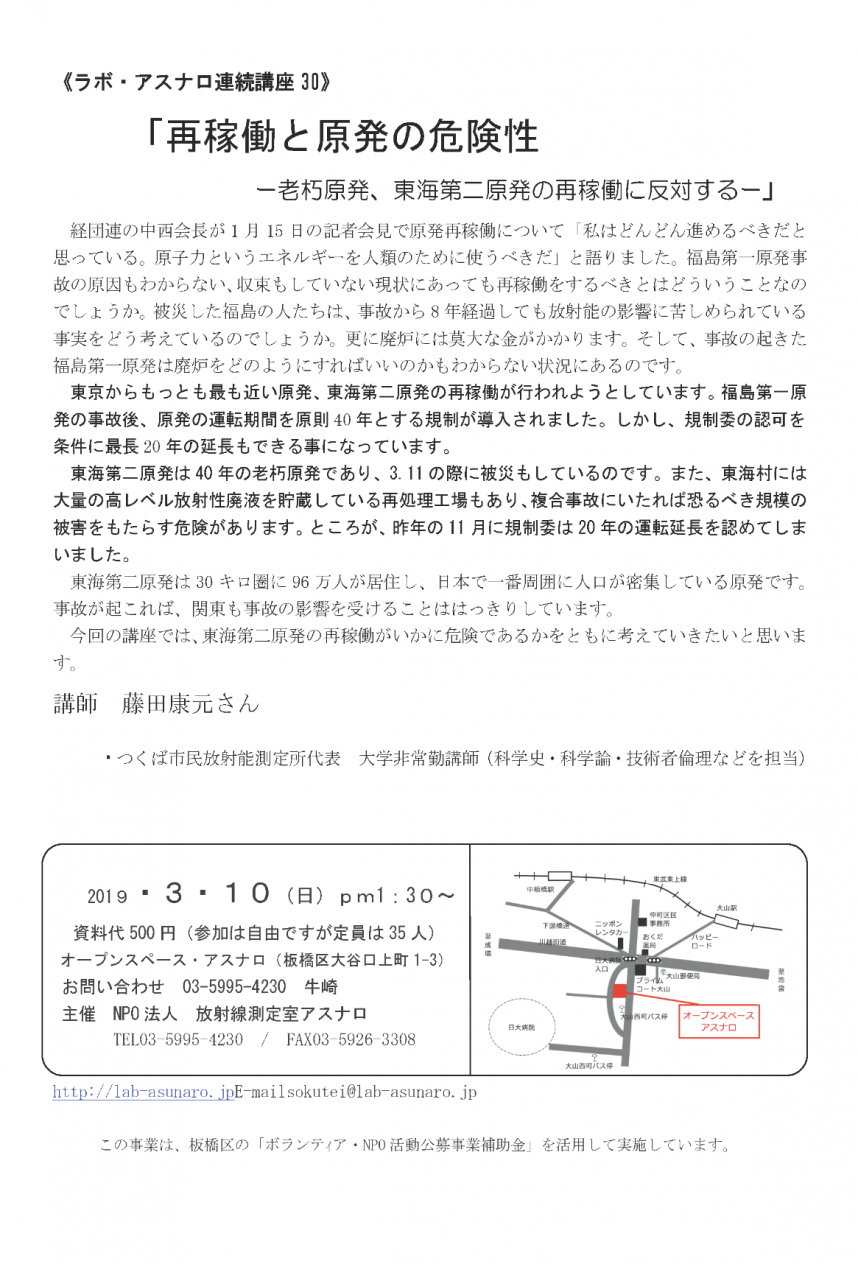 | 内容 | 経団連の中西会長が1月15日の記者会見で原発再稼働について「私はどんどん進めるべきだと思っている。原子力というエネルギーを人類のために使うべきだ」と語りました。福島第一原発事故の原因もわからない、収束もしていない現状にあっても再稼働をするべきとはどういうことなのでしょうか。被災した福島の人たちは、事故から8年経過しても放射能の影響に苦しめられている事実をどう考えているのでしょうか。更に廃炉には莫大な金がかかります。そして、事故の起きた福島第一原発は廃炉をどのようにすればいいのかもわからない状況にあるのです。 東京からもっとも最も近い原発、東海第二原発の再稼働が行われようとしています。福島第一原発の事故後、原発の運転期間を原則40年とする規制が導入されました。しかし、規制委の認可を条件に最長20年の延長もできる事になっています。 東海第二原発は40年の老朽原発であり、3.11の際に被災もしているのです。また、東海村には大量の高レベル放射性廃液を貯蔵している再処理工場もあり、複合事故にいたれば恐るべき規模の被害をもたらす危険があります。ところが、昨年の11月に規制委は20年の運転延長を認めてしまいました。 東海第二原発は30キロ圏に96万人が居住し、日本で一番周囲に人口が密集している原発です。事故が起これば、関東も事故の影響を受けることははっきりしています。 今回の講座では、東海第二原発の再稼働がいかに危険であるかをともに考えていきたいと思います。 ●講師 藤田康元さん ・つくば市民放射能測定所代表 大学非常勤講師(科学史・科学論・技術者倫理などを担当) E-mail: sokutei★lab-asunaro.jp (★を@に変えてメールください) この事業は、板橋区の「ボランティア・NPO活動公募事業補助金」を活用して実施しています。 |