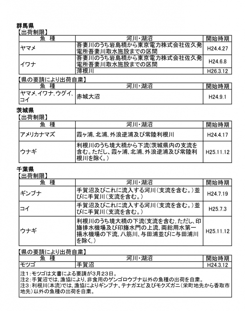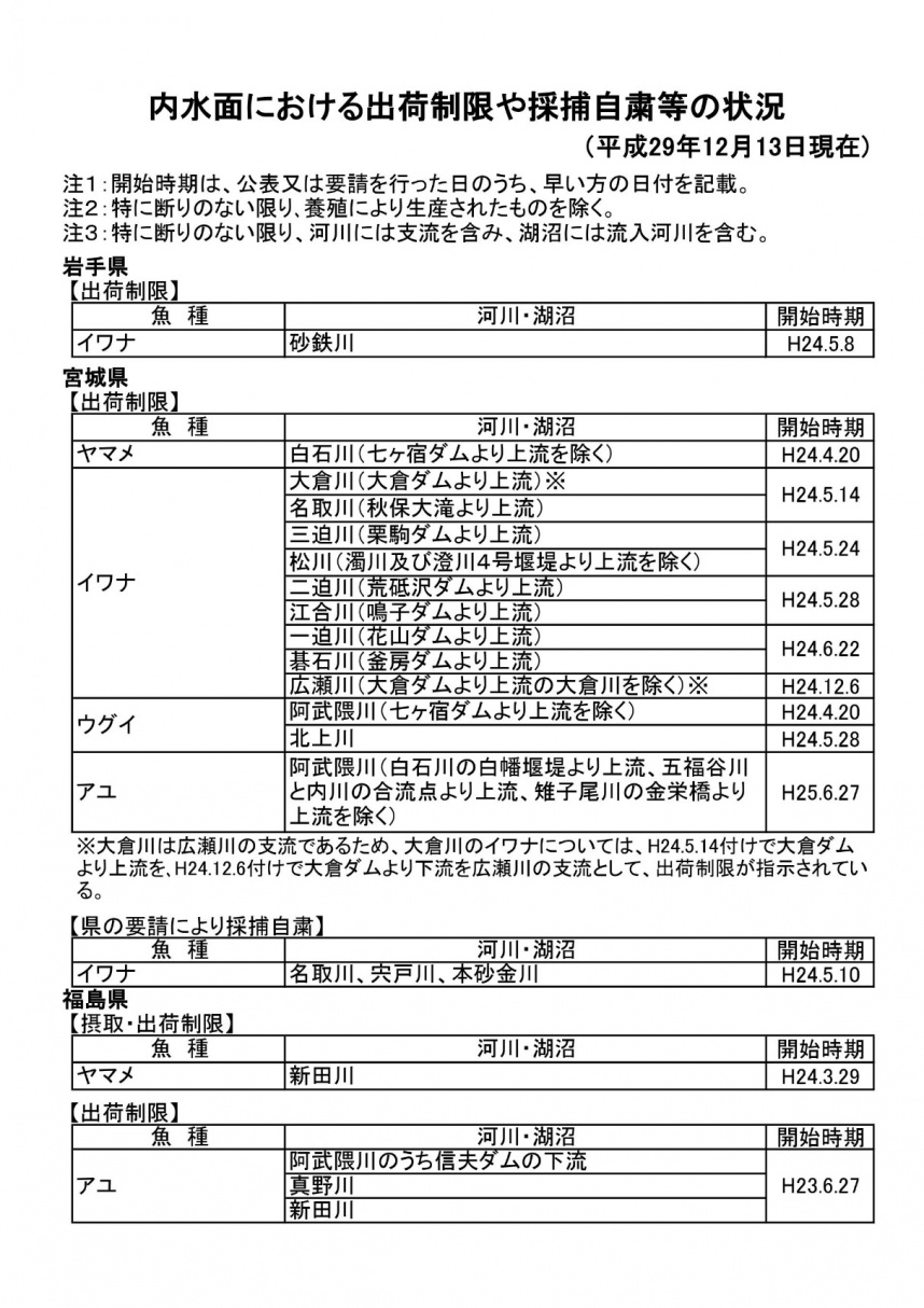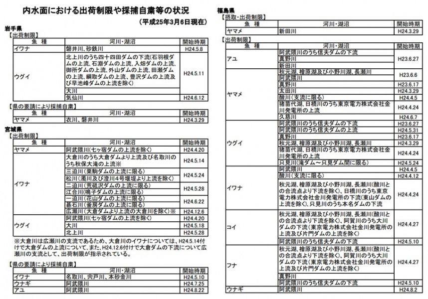 水産庁資料では、川の汚染について「内水面」という表現で調査・測定結果を掲載しています。 以下、調査結果です。 2013年3月6日の出荷制限および自粛の状況です。