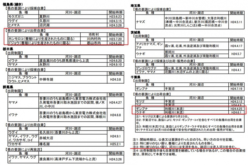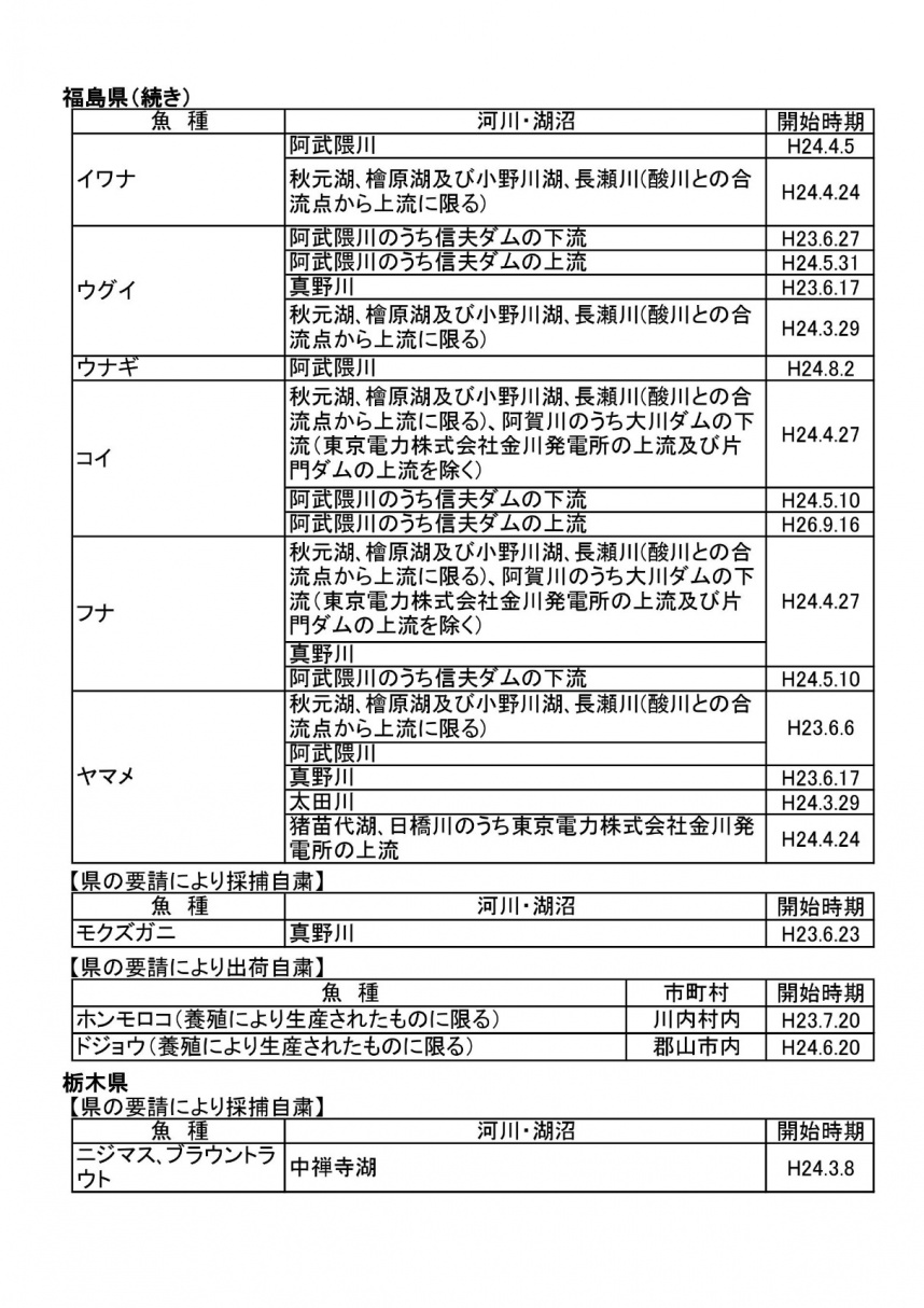 川の出荷制限および採捕(釣りの)自粛状況