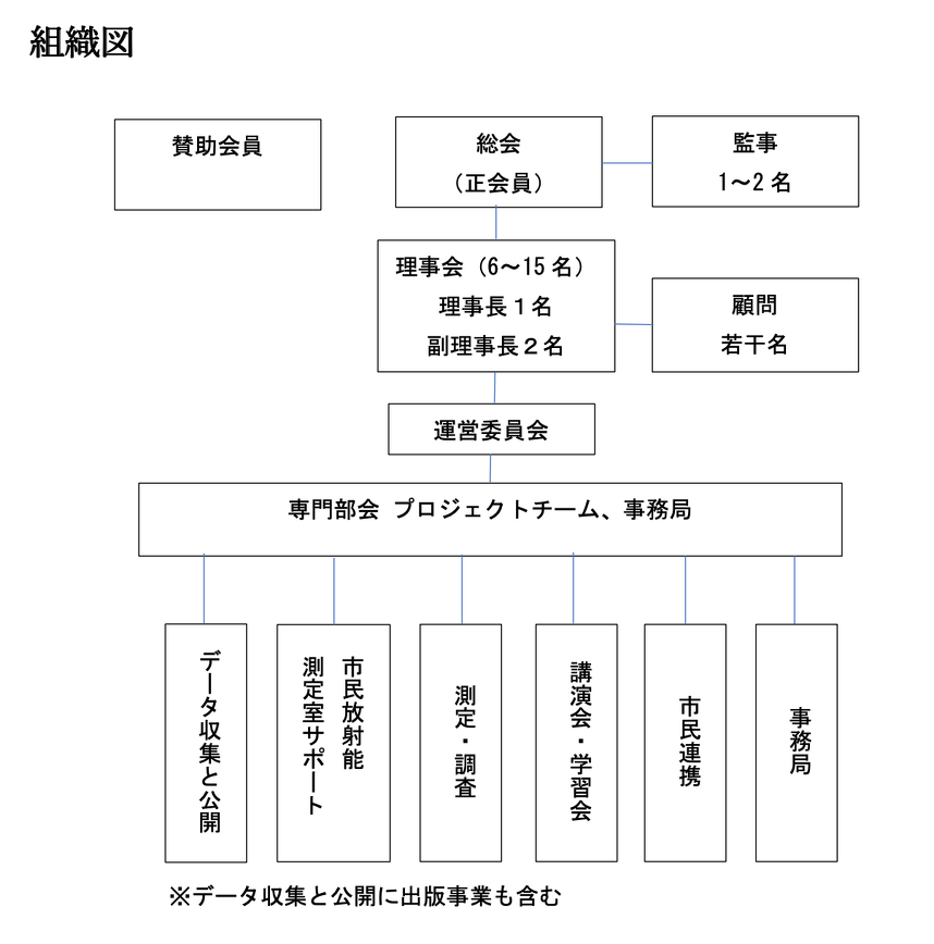 組織図 および 理事・監事 理事・監事 理事長 阿部浩美 副理事長 村上直行 副理事長 藤田康元 理事 大沼淳一 同 楠本泰一郎 同 清水義広 同 谷山實 同 高岡章夫 同 富塚とも子 監事 杉原宏喜 同 田中保子 顧問 石原佳典(みんなのデータサイト データベース開発者・プログラマー) 牛山元美(さがみ生協眼科・内科 内科部長) 斉藤賢爾(早稲田大学大学院教授) 平井有太(アーティスト・UPDATER TADORi 編集室)