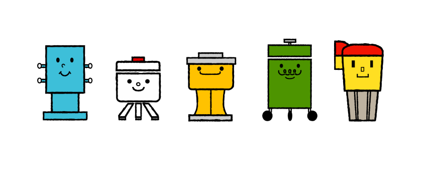 マリネリくんの仲間、測定器ファミリーは、市民測定室が持っている様々なメーカー(機種)の測定器をモチーフにしたキャラクターです。