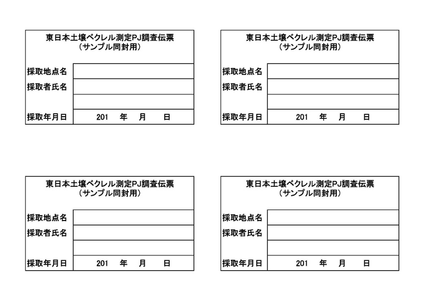 土壌検体は見分けがつかなくなるので、必ず伝票に記入し、二重のビニール袋の1枚目と2枚目の間に入れて、測定室へお渡しください。