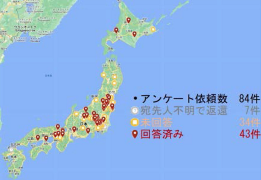 アンケートの依頼をお送りできているのは現在84ヶ所です。福島原発事故後、最大では100カ所以上は立ち上がったと言われている市民放射能測定室ですが、現在の連絡先がわからなくなっていたり、お送りしたアンケートが住所不明で届かずに戻ってきてしまったケースもあります。また、そもそも私たちが知り得ていない市民測定室はまだあると推察されます。
